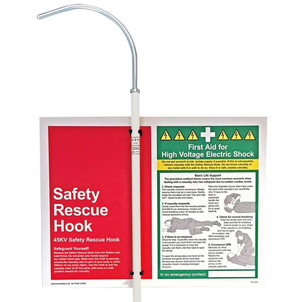 An electrical rescue kit comprising a 45kV insulated rescue stick and a wall-mounted safety panel for prominent storage in the workplace. The panel includes printed first-aid guidance for electric shock.