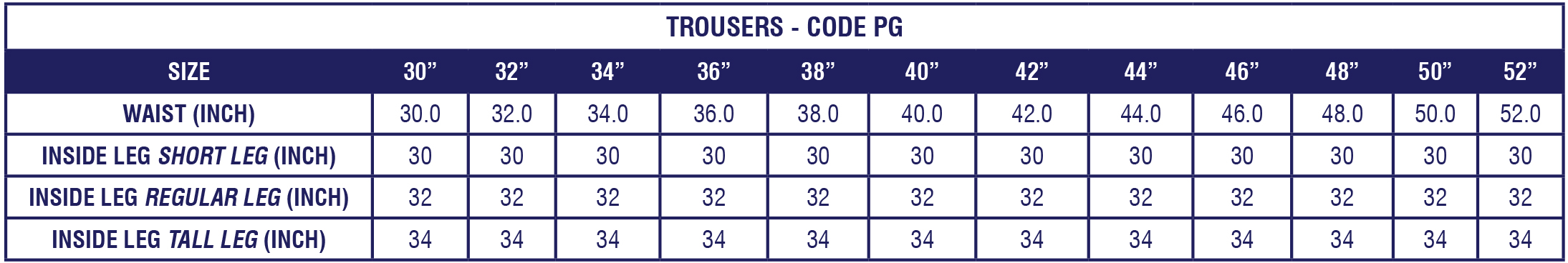 - Sizes: 32"-42" Short Leg (31"/76cm), 30"-52" Regular Leg (32"/81cm) and 30"-44"Tall Leg (34"/86cm)