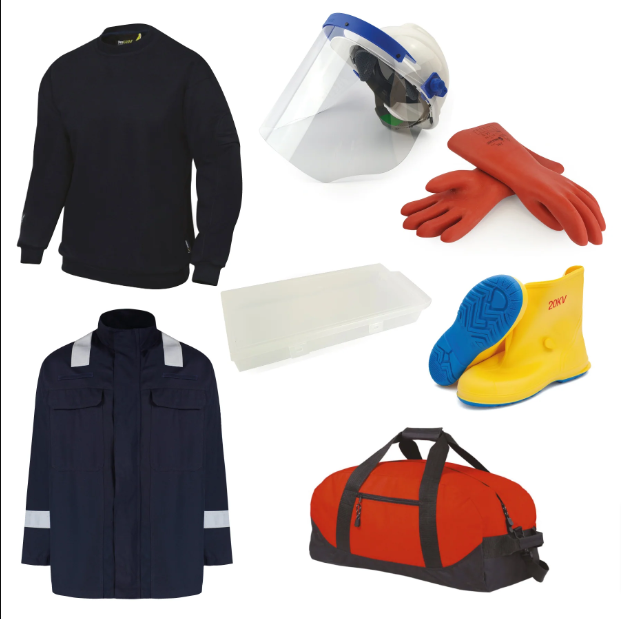 The EV PPE pack provides a complete kit for a technician comprising of: Composite Insulating Gloves; Glove Storage Box; Class 1 faceshield and helmet; Dielectric overboots; arc flash jacket; polo shirt; holdall.